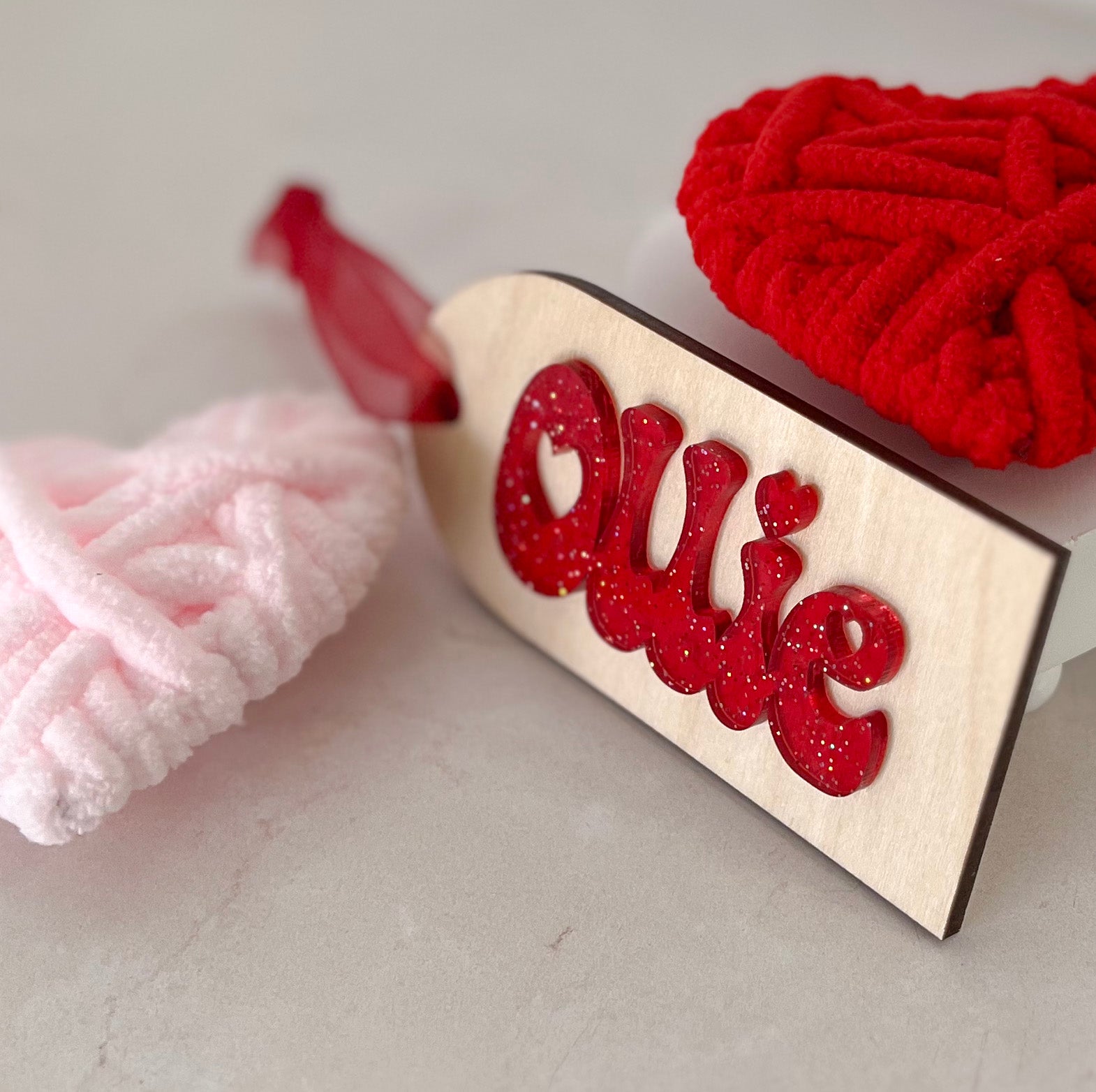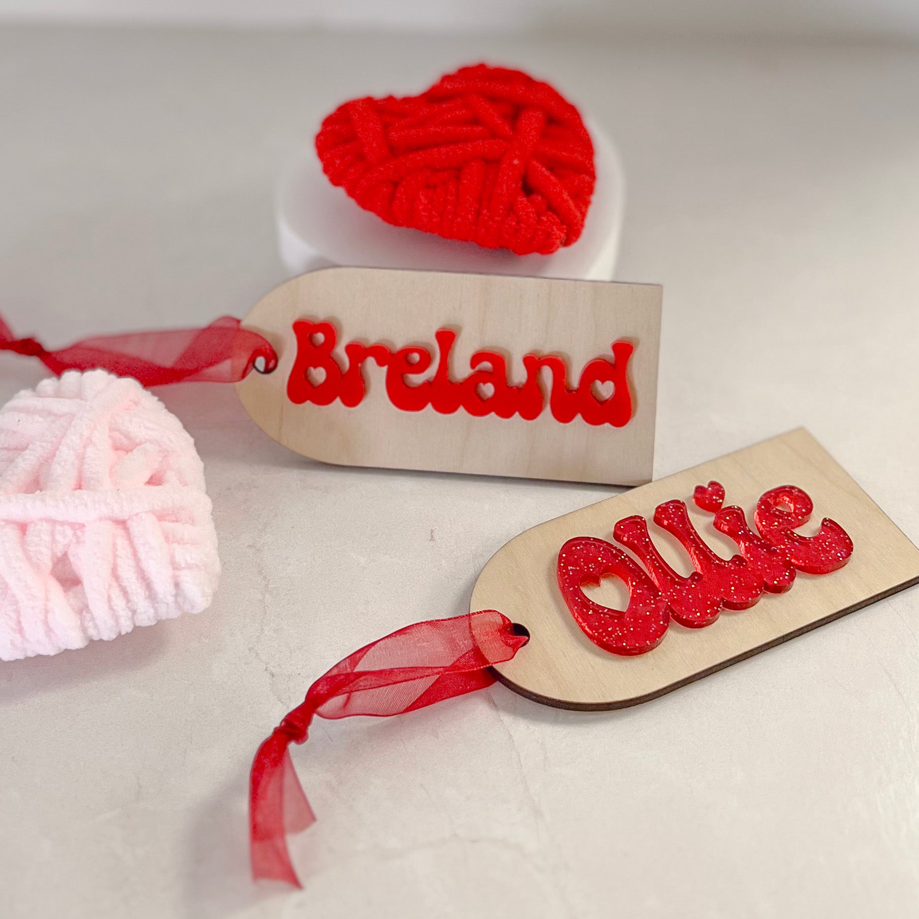 Make your loved ones feel special with these personalized tags! These gift tags are made with a sturdy backing of birch wood and topped with the name of your choosing in acrylic.